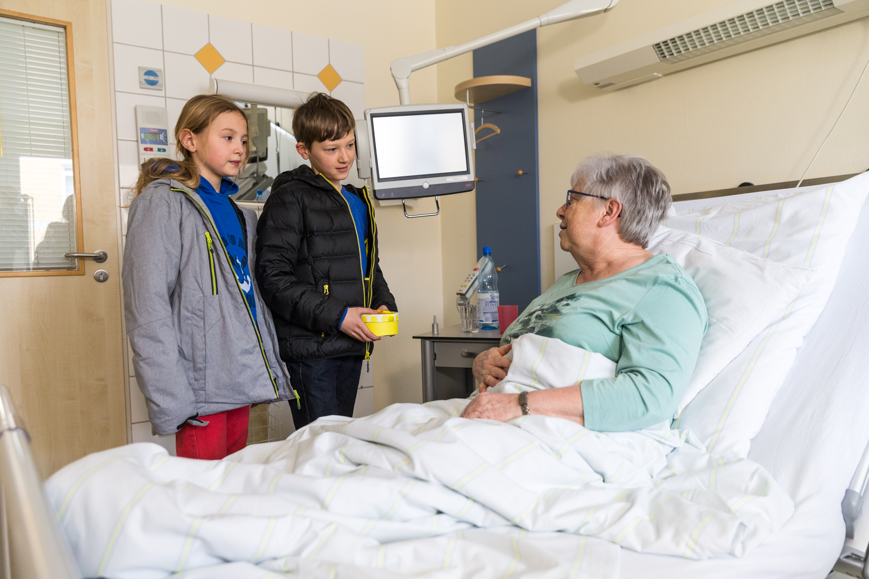 Deine Oma bekommt dann ein Bett auf einer Station, wo auch andere Patienten mit der gleichen oder einer ähnlichen Krankheit versorgt werden. In einem Zimmer stehen meistens zwei bis drei Betten, aber manchmal bekommt deine Oma auch ein Einzelzimmer.